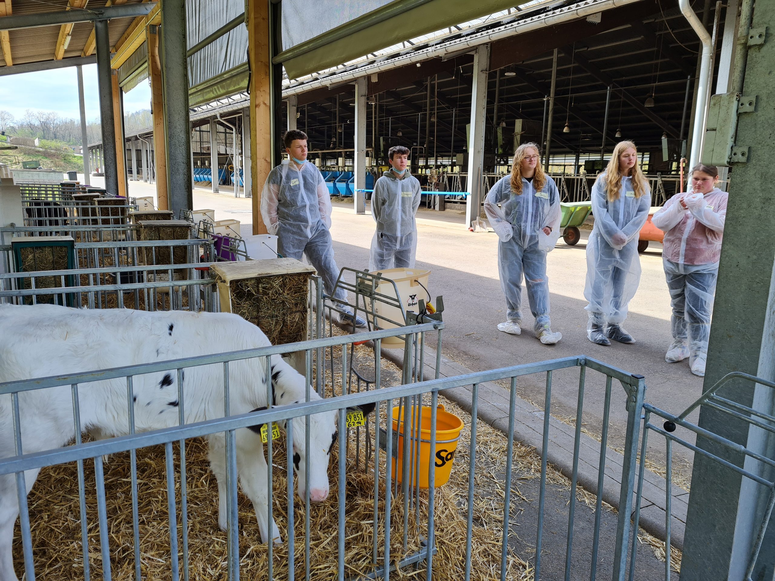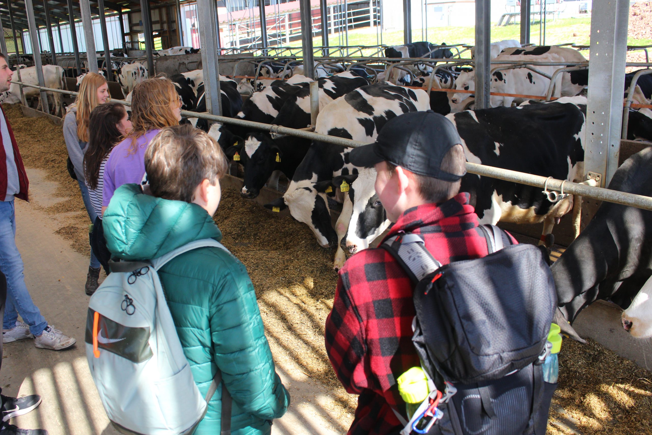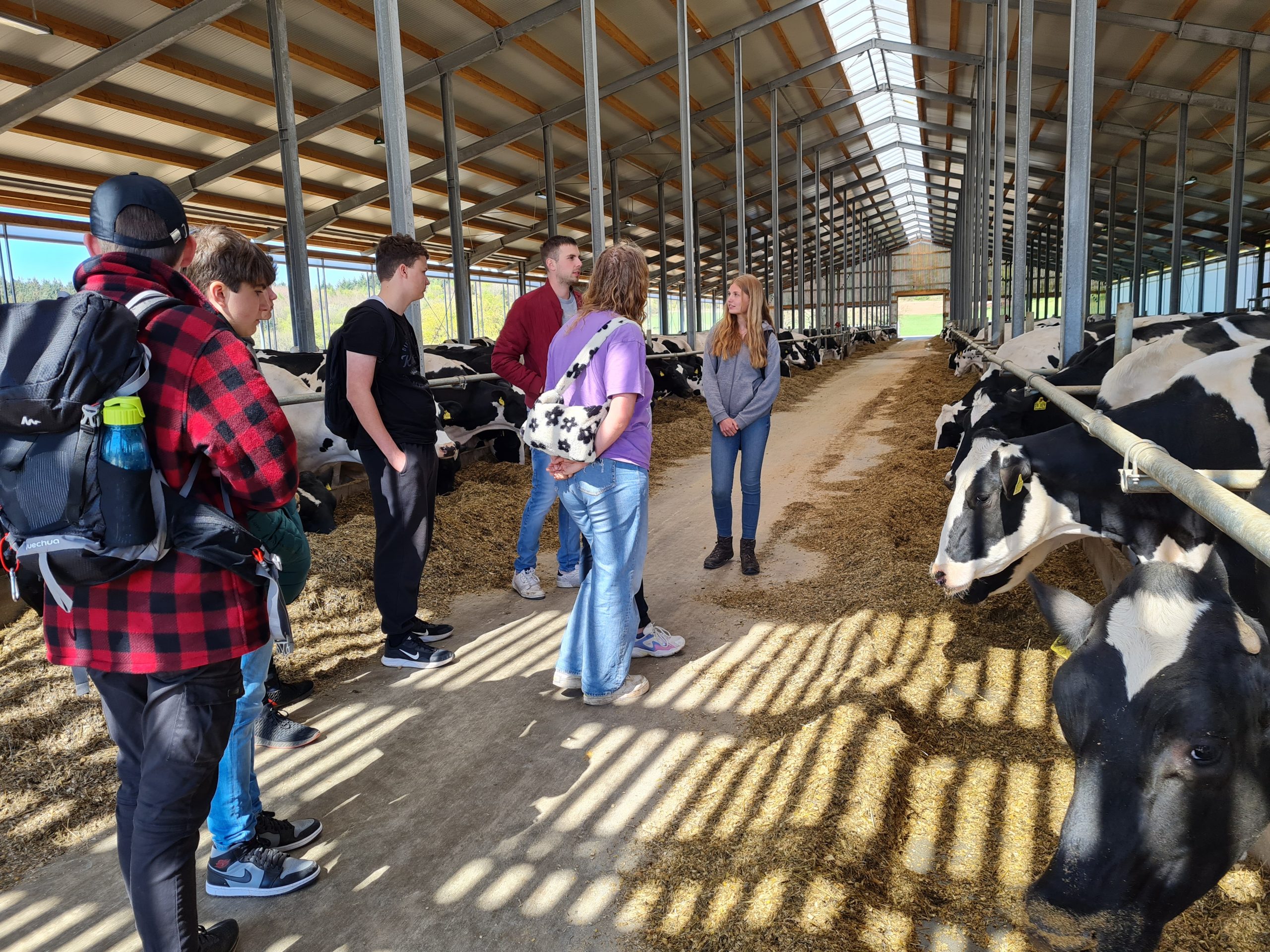 Im Anschluss ging es nach Bockenau auf den Milchviehbetrieb Lindenhof der Familie Essich. Nach einer kurzen Begrüßung durch Andreas Essich übernahm Sohn Moritz die Führung über den Betrieb. Der Lindenhof hält 430 Milchkühe und produziert auf 200 Hektarn Ackerfläche Futtermittel für die Tiere. Durch die große Zahl der Tiere kommen täglich Kälber zur Welt und müssen entsprechend versorgt werden. Für die Jugendlichen waren diese Dimensionen beeindruckend. Neben den Stallanlagen wurde den Teilnehmern auch die Biogasanlage gezeigt und ihre Funktionsweise erklärt. Familie Essich bietet jungen Menschen immer gerne die Möglichkeit, auf dem Betrieb Praktika zu absolvieren und beschäftigt immer auch 2-4 Auszubildende. Auch die Teilnehmer seien gerne willkommen, mal auf dem Hof ein Praktikum zu machen.