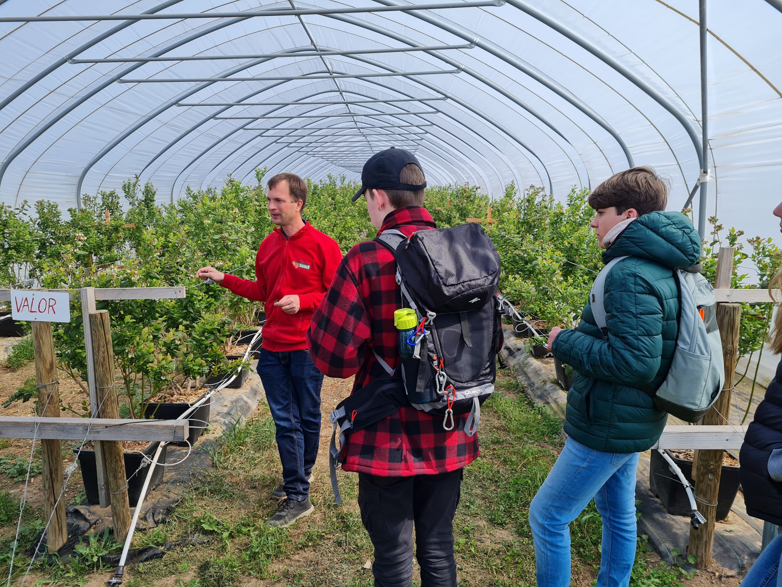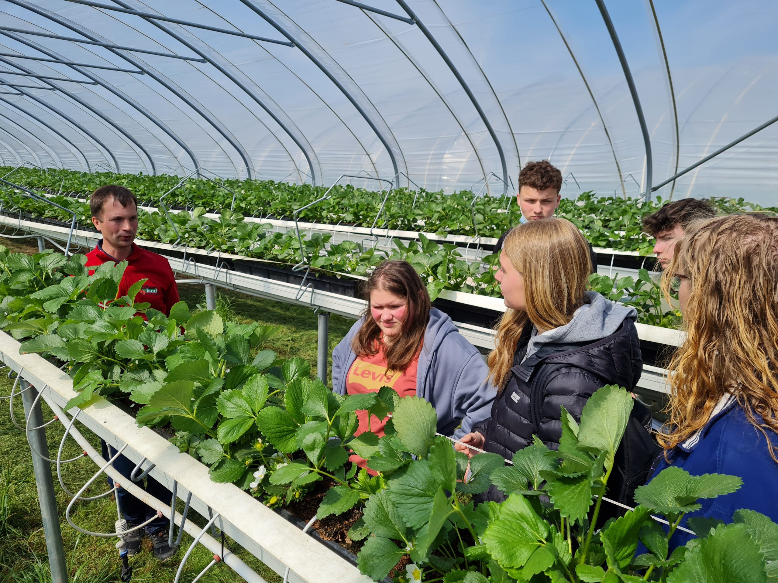 Hier betreibt die Familie Funck den Obst- und Ackerbaubetrieb Erdbeerland Funck Gbr. Alexander Seiler führte durch die modernen Gewächshausanlagen, in denen Erd- und Himbeeren angebaut werden. Der Betrieb bewirtschaftet auch klassische Erdbeerfelder mit Tunnelanbau. Der Anbau im Gewächshaus bietet natürlich mehr Kontrolle über Bewässerung und Klima, so dass die Früchte nicht komplett Wetter und Witterung ausgesetzt sind. Doch auch im Gewächshaus kann eine frostige Nacht schnell zu komplettem Ernteausfall führen, wenn das Team nicht schnell genug reagiert, so Seiler. Ein betriebswirtschaftliches Risiko, das der Betrieb tragen muss. Neben Erd- und Himbeeren produziert der Betrieb zudem Spargel. Die Gruppe konnte im anschließenden Rundgang über das Betriebsgelände zuschauen, wie Früchte und Spargel gewaschen, in Kisten gefüllt und mit einem ganzen Fuhrpark an Sprintern in die etlichen Verkaufsstellen in ganz Rheinland-Pfalz transportiert werden. In der Spitze sind bis zu 200 Arbeitskräfte nötig, um dies alles logistisch bewerkstelligen zu können. Zum Abschied bekam die Gruppe noch frische Erdbeeren, die am gleichen Morgen noch auf dem Feld geerntet wurden. Frischer geht’s nicht.