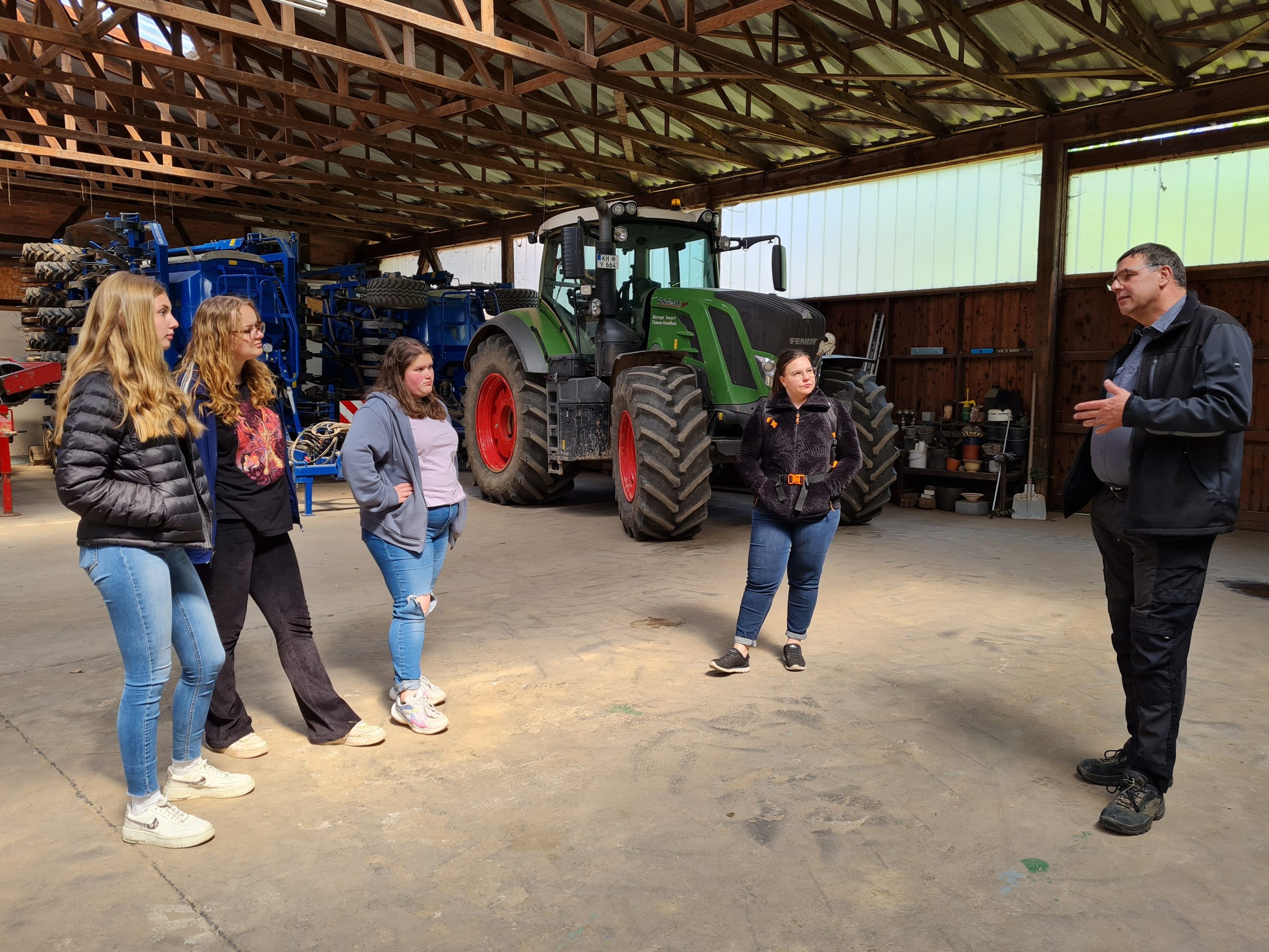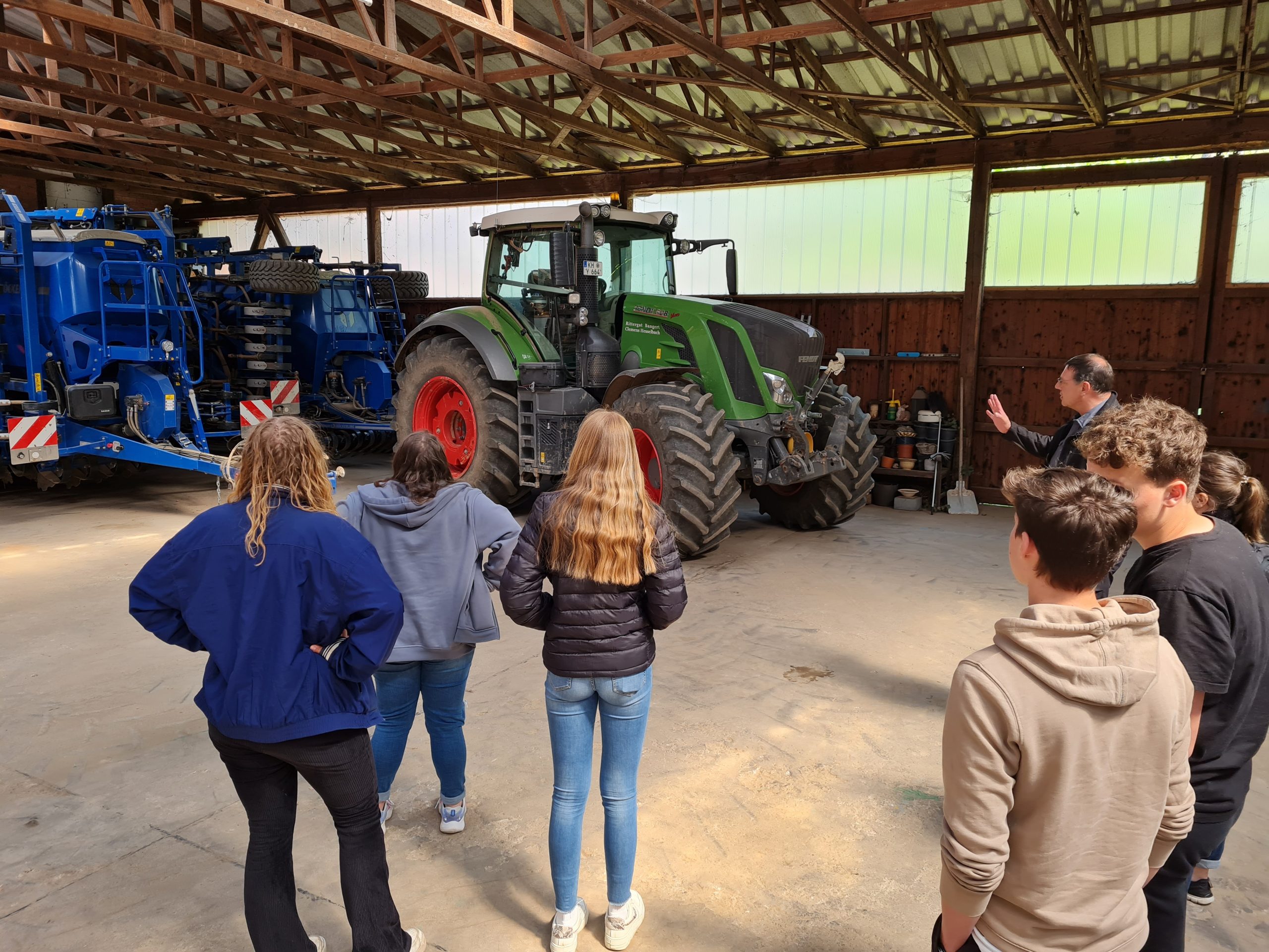 Der letzte Betriebsbesuch der Erlebnistour 2022 führte in das Rittergut Bangert, unweit der Deula. Hier betreibt die Familie Hesselbach einen Ackerbaubetrieb sowie einen Agrarhandel. Clemens Hesselbach führte über das Gut und präsentierte Teile des modernen Landmaschinen-Fuhrparks. Da der Betrieb 500 Hektar im Ackerbau bewirtschaftet, sind neben Maschinen natürlich auch motivierte Mitarbeiter wichtig. Daran ändert auch moderne Technik nichts. Diese könne den Menschen nicht ersetzen und mache den Beruf des Landwirten nicht überflüssig, sondern anspruchsvoller. An der Landwirtschaft Interessierten legte er nahe, unbedingte eine praktische Ausbildung zu absolvieren und nicht direkt nach der Schule in ein Studium zu starten. Die Ausbildung schaffe ein solides Fundament, auf dem aufgebaut werden könne. Neben dem Studium seien danach auch der Meister und Techniker gute Weiterbildungsmöglichkeiten.